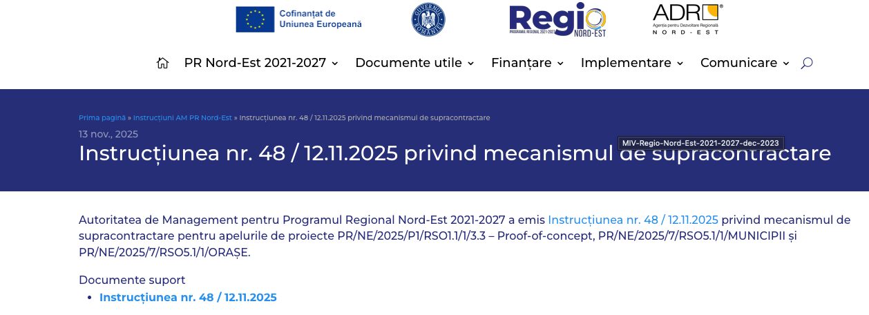 Autoritatea de Management pentru Programul Regional Nord-Est 2021-2027 a emis Instrucțiunea nr. 48 / 12.11.2025 privind mecanismul de supracontractare pentru apelurile de proiecte PR/NE/2025/P1/RSO1.1/1/3.3 – Proof-of-concept, PR/NE/2025/7/RSO5.1/1/MUNICIPII și PR/NE/2025/7/RSO5.1/1/ORAȘE.