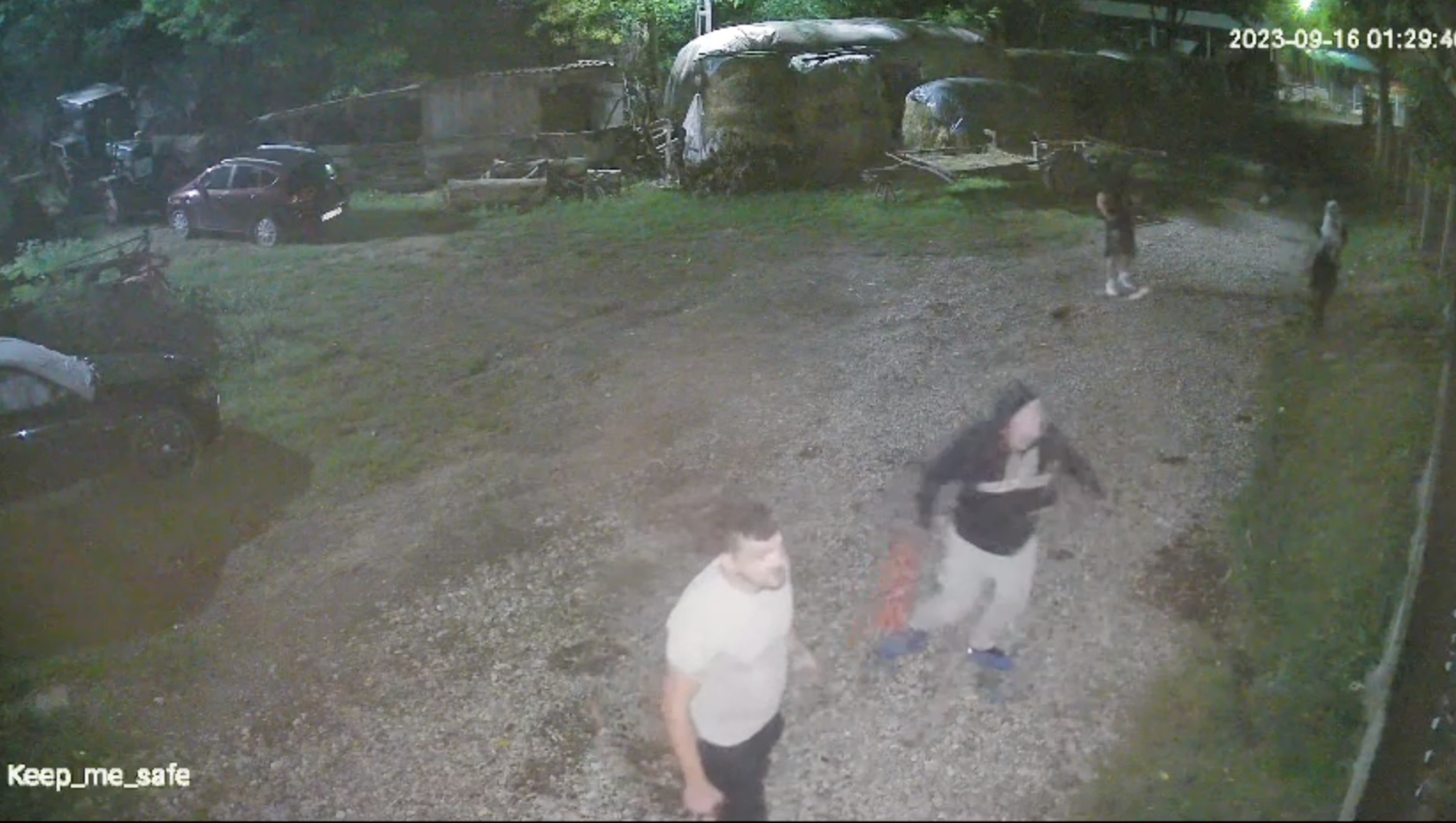 Aceștia strigă la poartă sa iasa o anume persoana, iar intre timp lovesc in gard, intr-o masina si arunca cu pietre in curte. Se aud amenintari, precum si vocile celor agresati.
