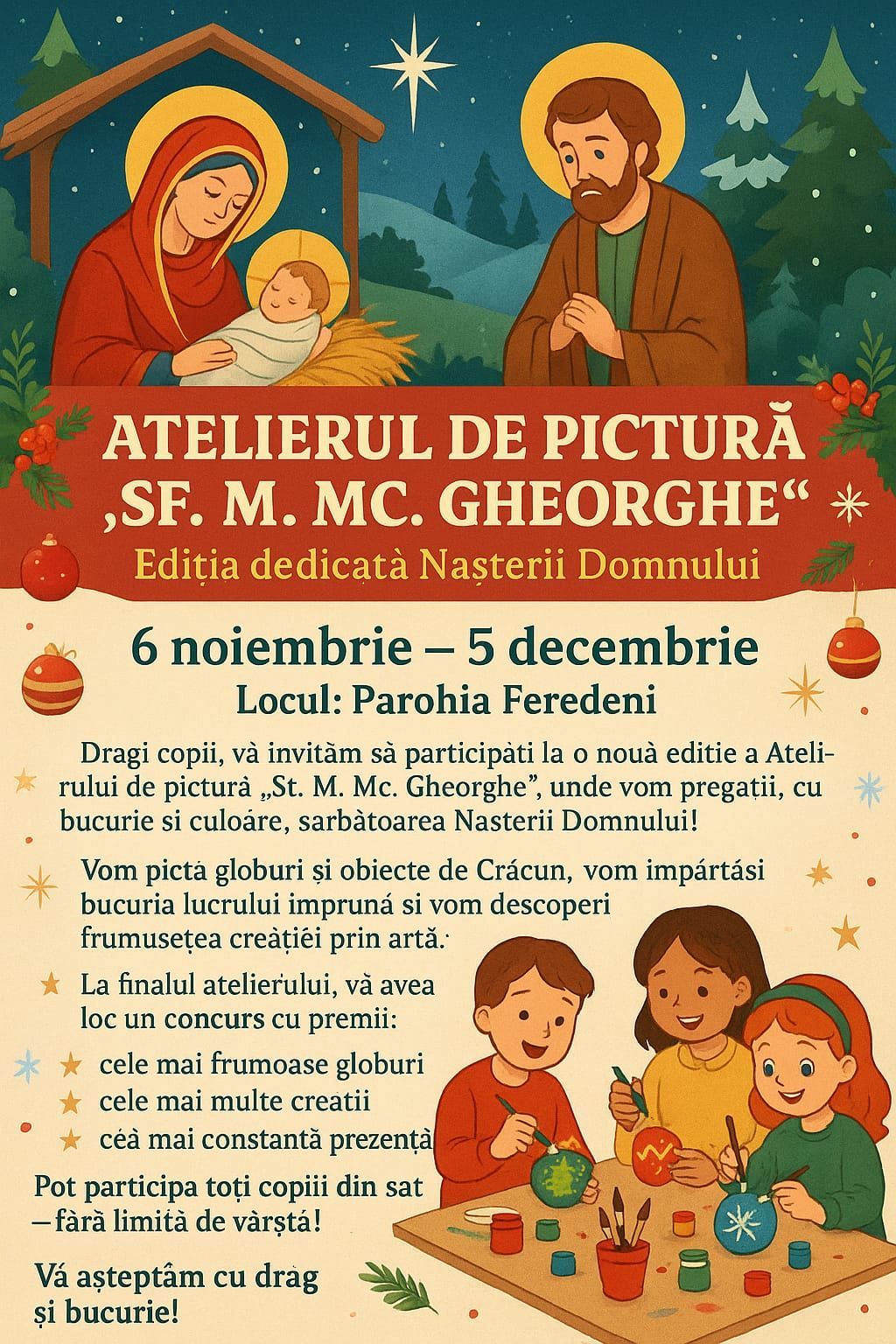 Vă așteptăm cu mult drag și bucurie să pictăm împreună lumina și frumusețea Nașterii Domnului!