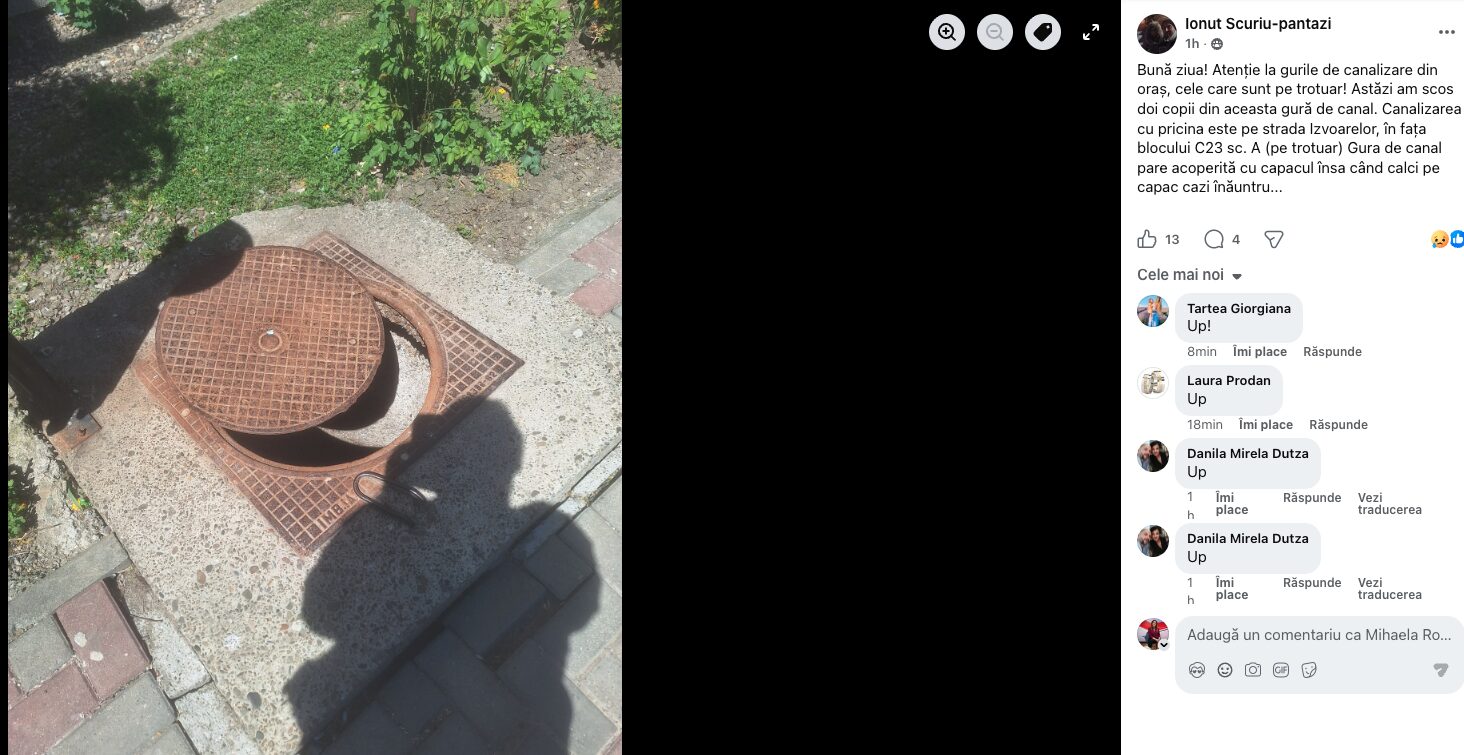 „Bună ziua! Atenție la gurile de canalizare din oraș, cele care sunt pe trotuar! Astăzi am scos doi copii din aceasta gură de canal. Canalizarea cu pricina este pe strada Izvoarelor, în fața blocului C23 sc. A (pe trotuar) Gura de canal pare acoperită cu capacul însa când calci pe capac cazi înăuntru…” se arată într-o postare pe Facebook.