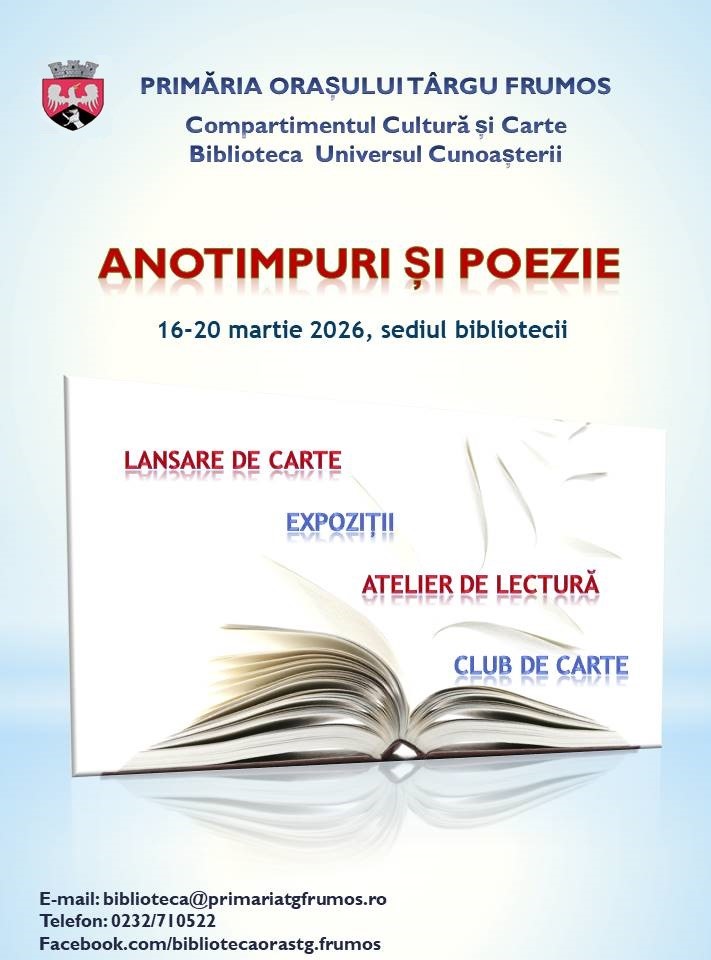 Biblioteca din Târgu Frumos sărbătorește poezia prin activități diverse în perioada 16-20 martie 2026. Instituția a pregătit lansare de carte, expoziții, atelier de lectură și un club de carte.