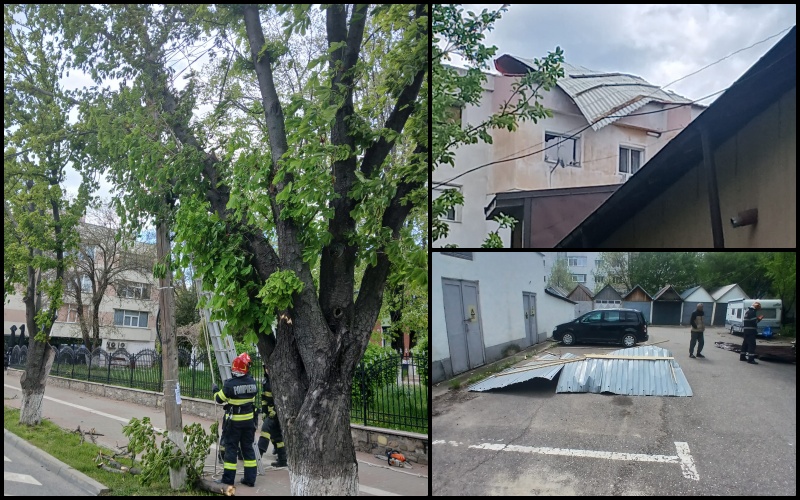 La Hârlău, au fost patru intervenții, în urma cărora pompierii au îndepărtat două acoperișuri avariate și doi arbori căzuți, inclusiv în zona Parcovaci.