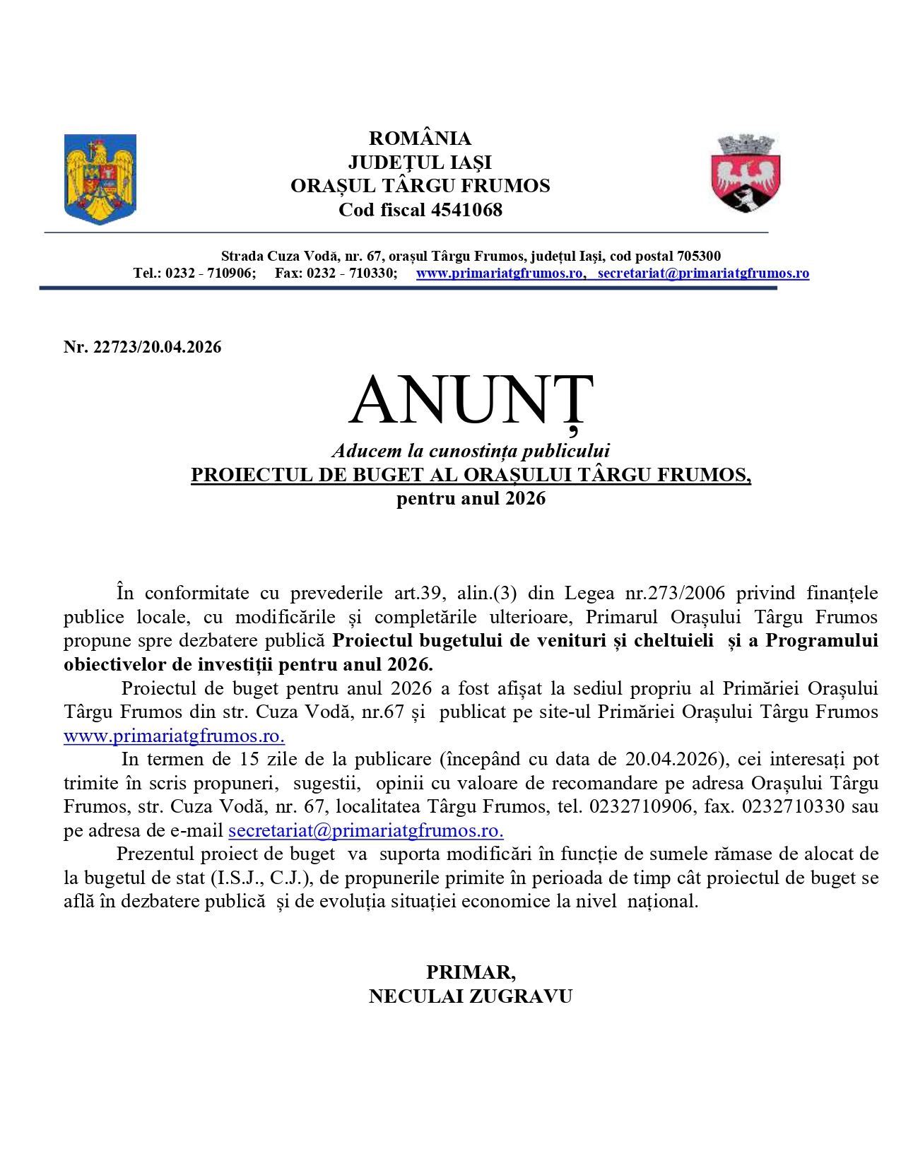 Bugetul orașului Târgu Frumos a fost publicat și se află în dezbatere publică. Primăria a postat un anunț în acest sens, iar persoanele interesate pot trimite în scris propuneri, sugestii și opinii cu valoare de recomandare în termen de 15 zile de la data de 20 aprilie pe adresa de mail [email protected] sau prin fax la numărul 0232710330.