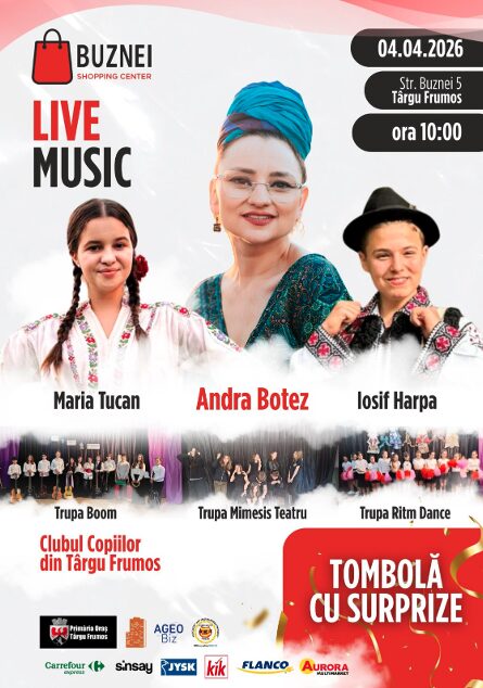 Noul centru comercial Buznei Shopping Center marchează deschiderea oficială a noii locații, printr-un eveniment special dedicat comunității locale, transformând o zi obișnuită de cumpărături într-o experiență plină de bucurie, muzică și surprize pentru întreaga familie. Concertul muzical va avea loc sâmbătă, 04 aprilie, începând cu ora 10:00, la sediul centrului comercial situat pe Str. Buznei nr. 5, Târgu Frumos, și va aduce împreună artiști consacrați, activități recreative și oferte speciale pentru vizitatori.