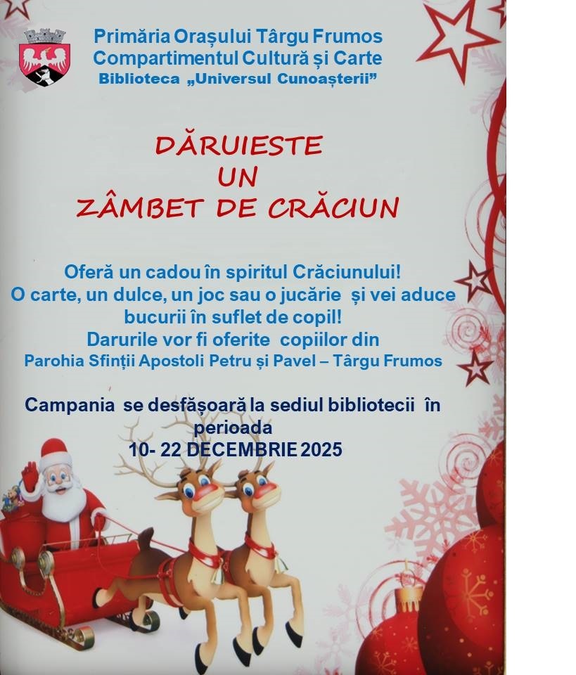 În această perioada, Primăria Târgu Frumos și Biblioteca „Universul Cunoașterii” organizează campania „Dăruiește un zâmbet de Crăciun”.