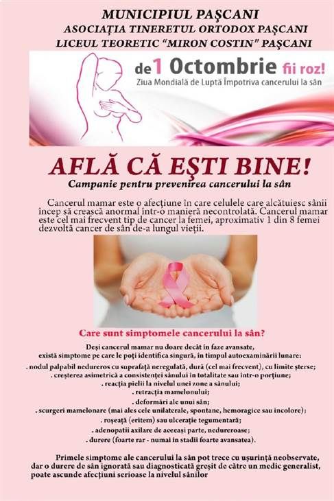 Primaria Pascani, in parteneriat cu Asociatia Tineretului Ortodox Pascani si Liceul „Miron Costin”, organizeaza pe 1 octombrie campania „Afla ca esti bine”, pentru prevenirea cancerului la san, in piateta „Mihail Sadoveanu”. De la ora 18:00, voluntarii vor imparti prin oras pliante informative, baloane si fundite roz. De asemenea, sunt instruiti sa discute cu trecatorii despre ce inseamna aceasta boala si cum se poate preveni.