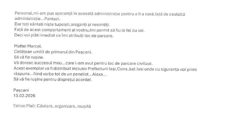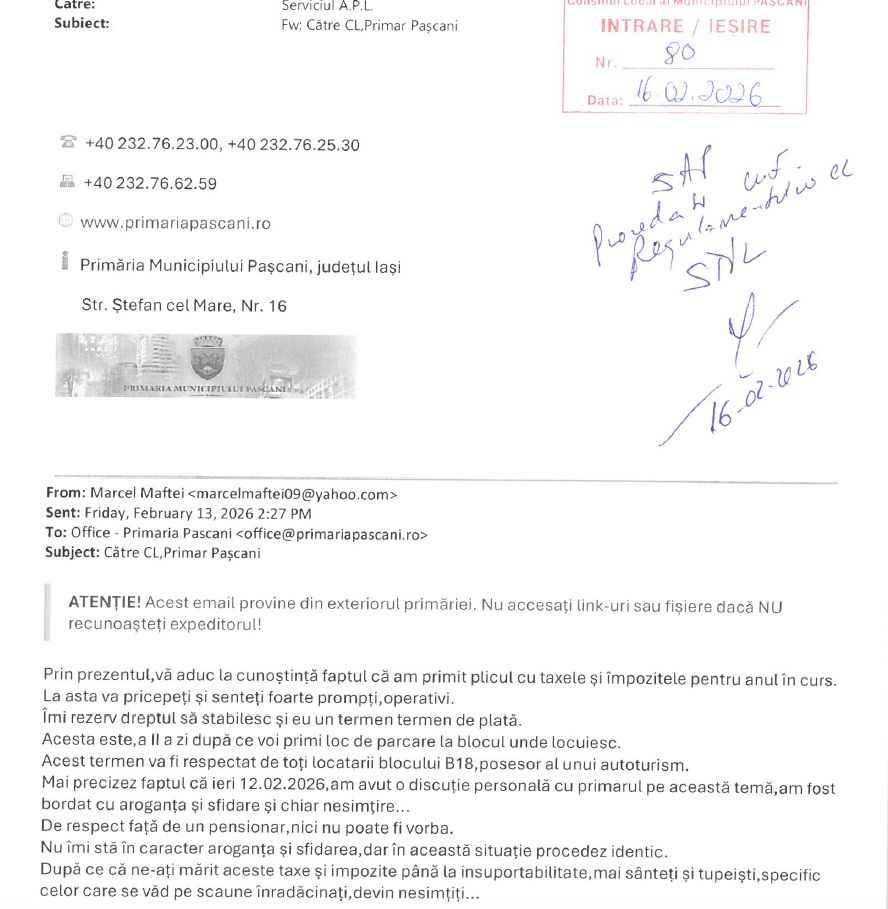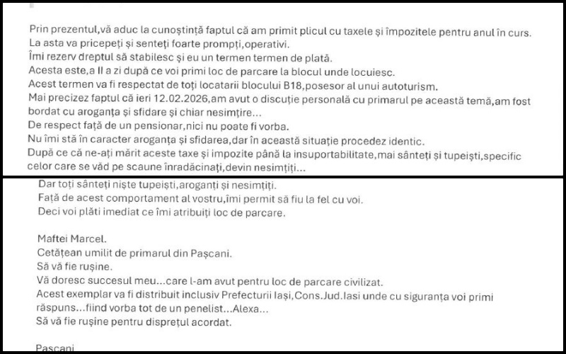 Marcel Maftei susține ca ar fi fost umilit de primarul municipiului Pașcani, Marius Pintilie in urma unei discuții cu acesta care ar fi avut loc pe 12 februarie ac. Se pare ca barbatul i-ar fi cerut edilului un loc de parcare in zona blocului B18 Pentru ca nu i-a fost rezolvata problema, cetățeanul spune ca își va achita taxele si impozitele locale abia a doua zi după ce Primăria va rezolva acesta cerere.