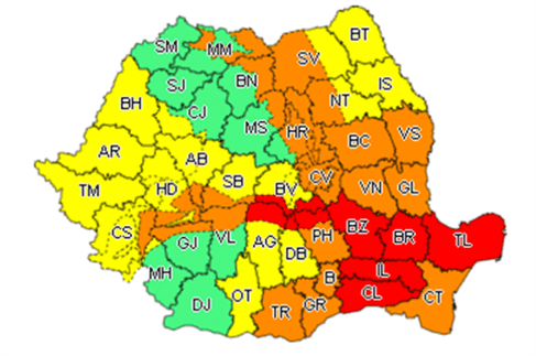 Tot sub COD ROȘU se vor afla județele Buzău, Brăila, Ialomița, Călărași și Tulcea, începând cu ora 22:00.