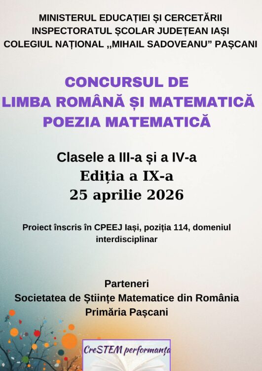 Colegiul Național „Mihail Sadoveanu” Pașcani organizează cea de-a IX-a ediție a Concursului interdisciplinar de limba română și matematică „Poezia Matematică”, dedicat elevilor din clasele a III-a și a IV-a.