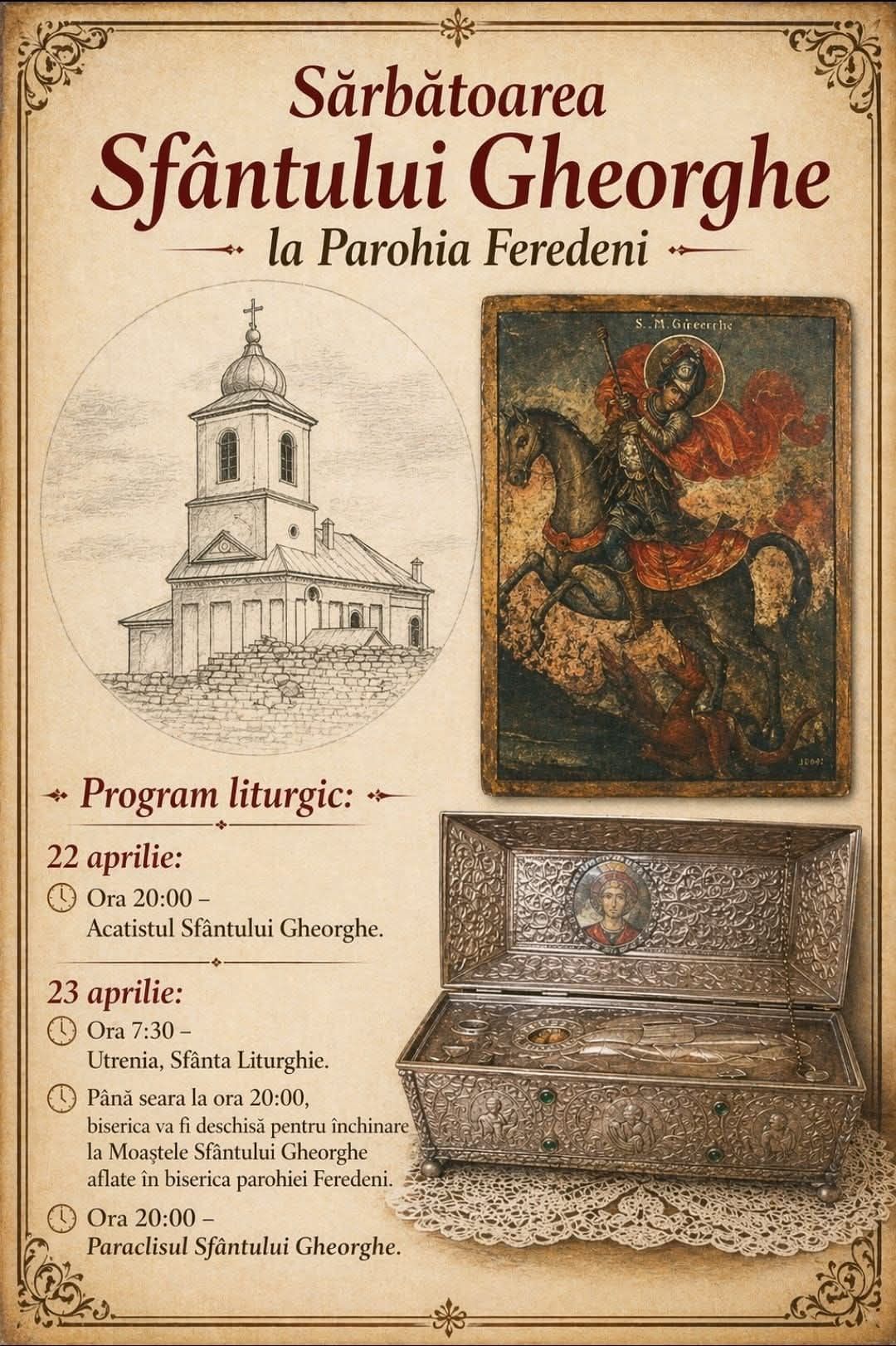 Un fragment din moaștele Sfântului Mare Mucenic Gheorghe, Purtătorul de biruință, se află de sute de ani în Biserica „Adormirea Maicii Domnului” din Feredeni.