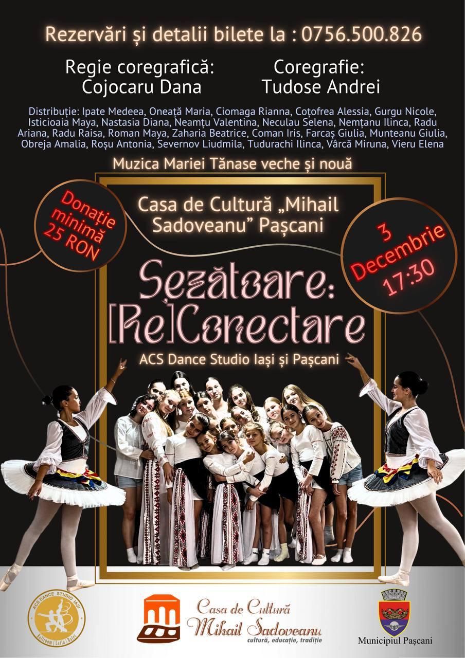 Este vorba despre spectacolul „Sezătoare: [Re]Conectare”, ce va avea loc pe 3 decembrie, de la ora 17:30, pe scena Casei de Cultură Mihail Sadoveanu din municipiul Pașcani, instituție parteneră în eveniment.