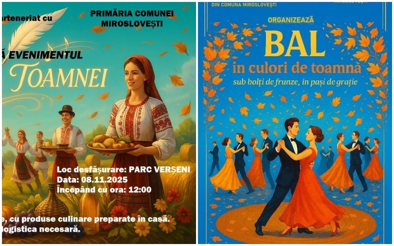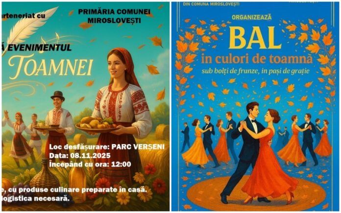 Primăria Comunei Miroslovești, în parteneriat cu Asociația Socio-Culturală „Tradiții și Generații” din Comuna Miroslovești, are deosebita plăcere de a vă invita în data de 08.11.2025 🗓️ să participați la manifestările dedicate Sărbătorii Toamnei, prilej de întâlnire a comunității, de valorizare a tradițiilor locale și de consolidare a cooperării intercomunitare. 🤝