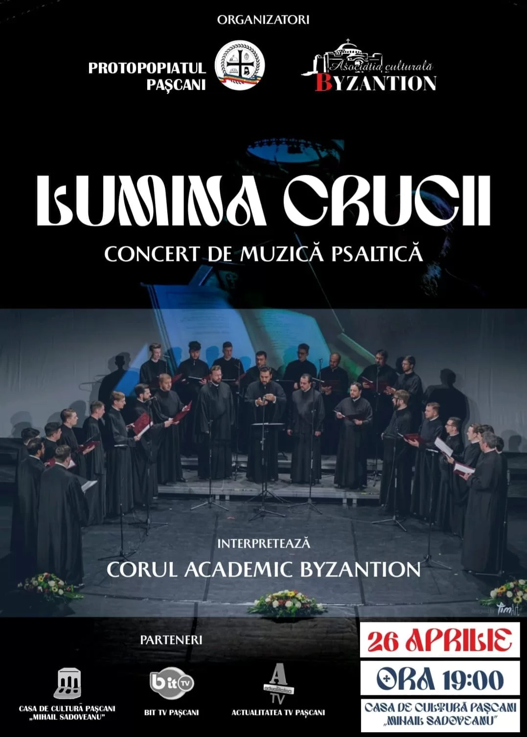 Protopopiatul Pașcani și Asociația Culturală Byzantion organizează înainte de Săptămâna Mare un concert de muzică psaltică, intitulat, „Lumina Crucii”. Evenimentul va avea loc pe 26 aprilie, de la ora 19:00, la Casa de Cultură Mihail Sadoveanu.