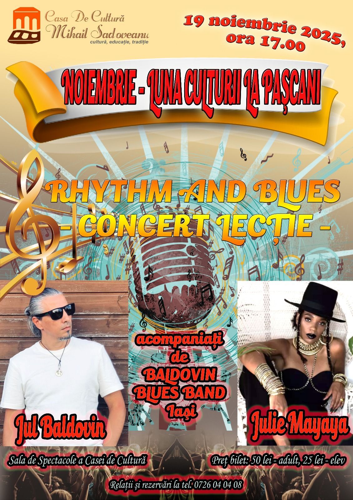Cu ocazia manifestărilor prilejuite de Zilele MIHAIL SADOVEANU – Luna Culturii la Pașcani, vă invităm la Concertul Lecție RHYTHM AND BLUES susținut de JUL BALDOVIN ȘI JULIE MAYAYA acompaniați de BALDOVIN BLUES BAND. Prețul unui bilet subvenționat este de 50 lei / adult și 25 lei / elev.