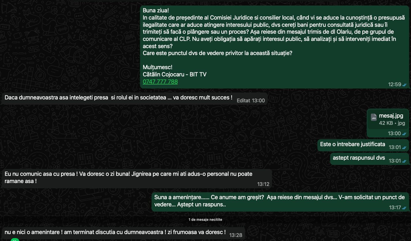 Consilierul Cătălin Conache a refuzat să comenteze această situație. Nici primarul Marius Pintilie nu a răspuns la întrebarea BIT TV cu privire la motivele excluderii lui Sorin Olariu de pe grupul de comunicare.