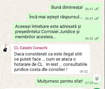 Aceeași întrebare a fost adresată și președintelui Comisiei Juridice din cadrul legislativului local, avocatul Cătălin Conache, dar acesta a lăsat să se înțeleagă că ar trebui să fie plătit pentru consultanță juridică, deși era vorba de apărarea unui interes public, sau Olariu să meargă în instanță.