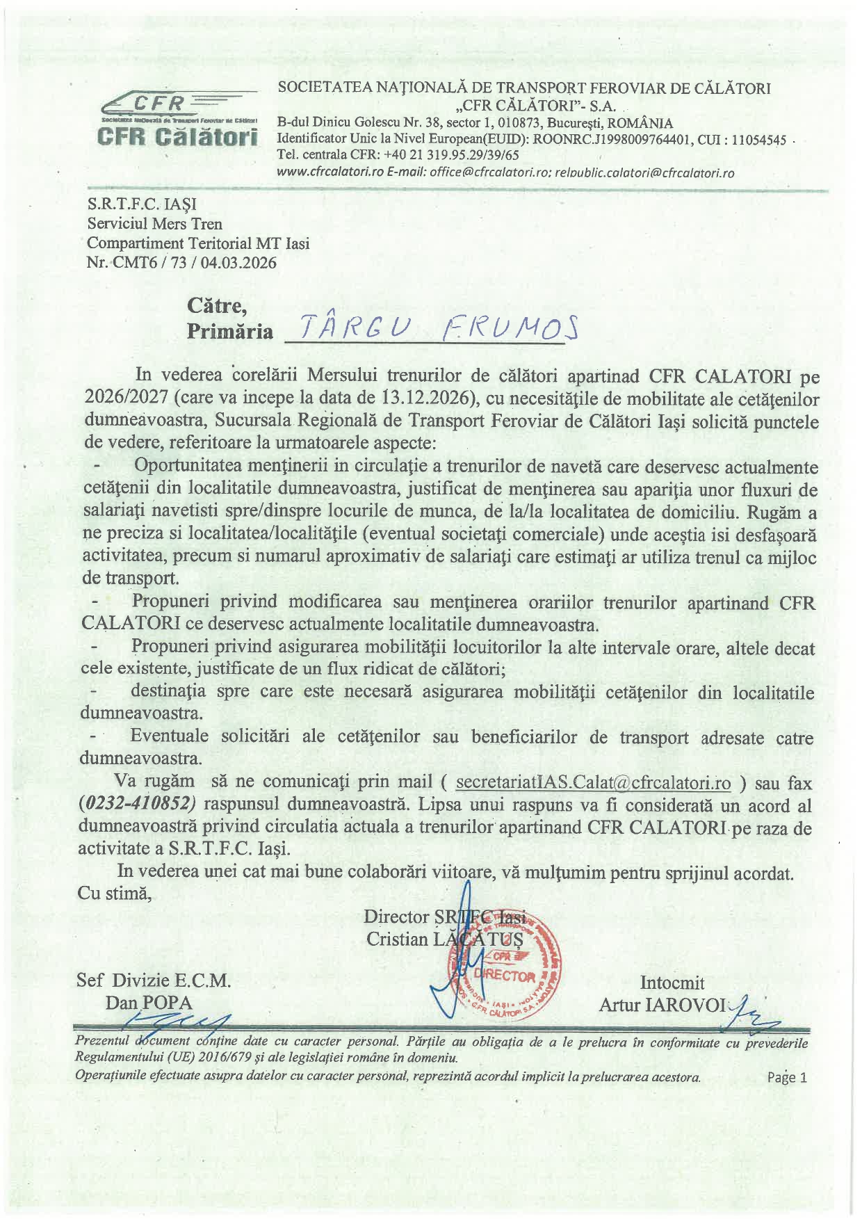 „CFR Călători consultă locuitorii din Târgu Frumos pentru noul Mers al Trenurilor 2026-2027! Compania vă solicită puncte de vedere referitoare la oportunitatea menținerii trenurilor de navetă actuale sau modificarea acestora în funcție de localitățile și societățile comerciale unde vă desfășurați activitatea. Scopul este asigurarea mobilității la intervale orare optime, acolo unde există un flux ridicat de călători către anumite destinații. Vă așteptăm în mesaje și comentarii cu sugestii și opinii, pe care le vom centraliza și le vom transmite companiei”, se arată în comunicatul CFR.