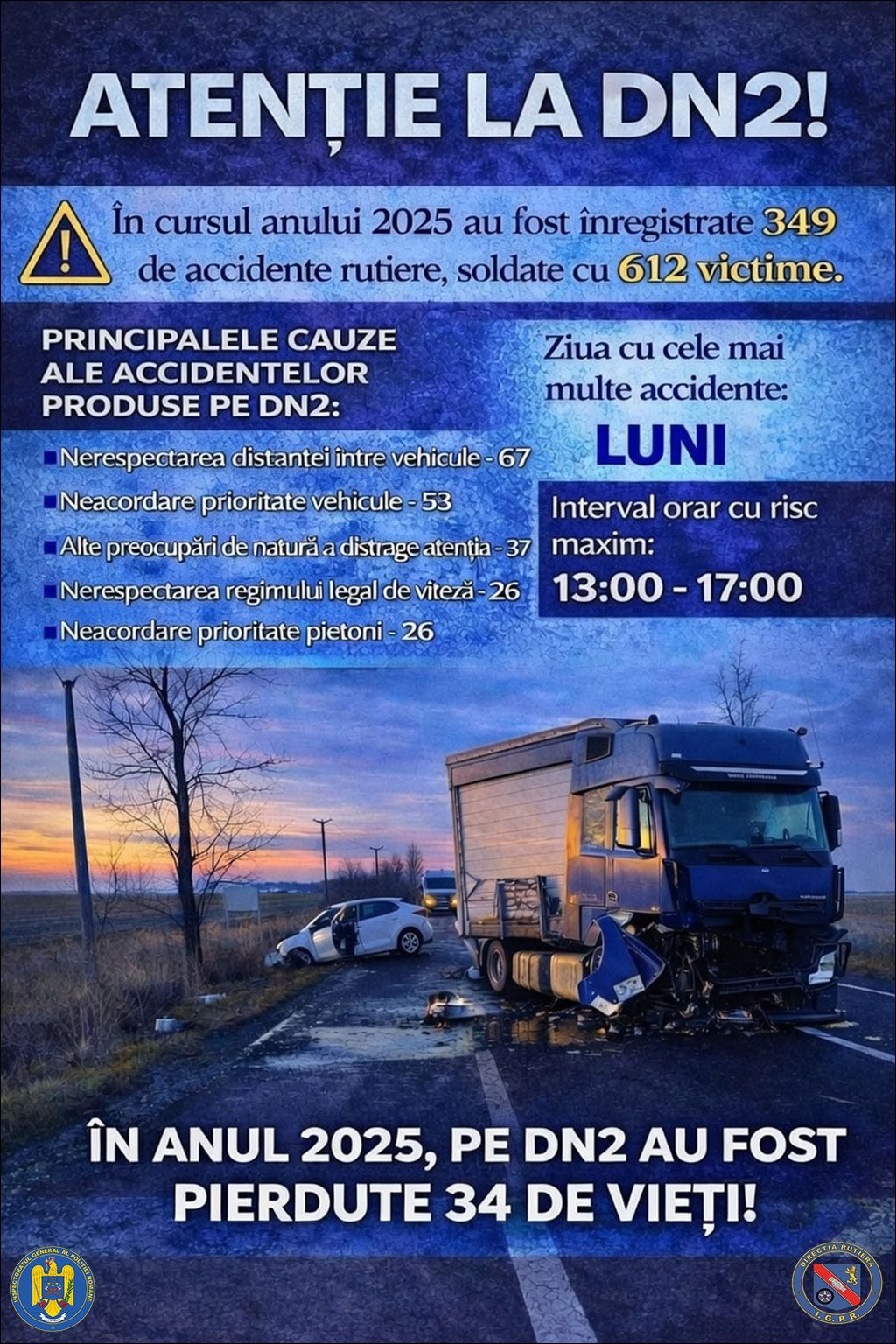 DN2 sau E85 rămâne unul dintre cele mai periculoase drumuri din țară. Doar în anul 2025, pe acest tronson au avut loc 349 de accidente rutiere, soldate cu 612 victime, iar 34 de oameni și-au pierdut viața. Cele mai multe accidente s-au produs lunea, în intervalul orar 13:00–17:00, atunci când traficul este intens, iar graba își spune cuvântul.