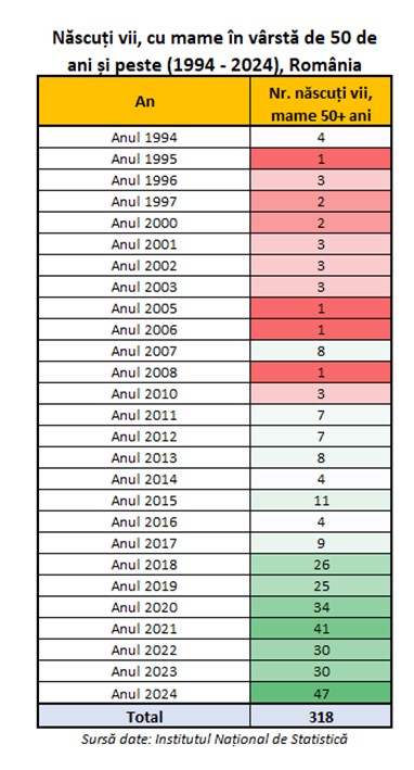 Dacă în 2015, la nivel național, erau înregistrate 11 nou-născuți ale căror mame aveau vârsta de 50 de ani și peste, în 2024, numărul a ajuns la 47, cel mai ridicat nivel din ultimele trei decenii. În același timp, numărul nașterilor a crescut și la grupa de vârstă a mamei de 45-49, de la 265 de nou-născuți vii în 2015, la 444 în 2024.