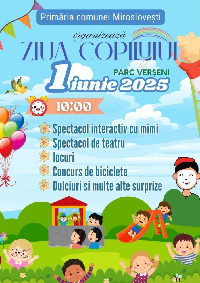 Ziua Copilului va fi sărbătorită cu multă voie bună și distracție pentru cei mici și în comuna Miroslovești, duminică, 1 iunie, de la ora 10, în parcul din localitatea Verșeni.