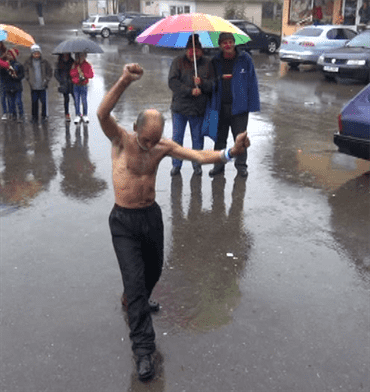 Bună dispoziţie i-a fost dată şi de câteva paharele cu alcool, care l-a încălzit pe bărbat până şi-a dat jos o parte din haine. Astfel, în faţa scenei şi a persoanelor care au venit la spectacolul artistic din cadrul evenimentului organizat în comuna Ruginoasa – Hora Satului, bunicuţul s-a unduit pe o melodie populară cum a ştiut mai bine. Ba mai mult, a luat şi apă de ploaie de pe jos şi si-a dat pe faţă, pentru împrospătare.