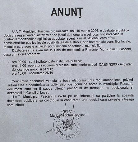 Dezbatere publică privind reglementarea activității sălilor cu jocuri de noroc pe raza municipiului Pașcani. Dezbaterile sunt programate pe 16 martie a.c., în sala de seminarii a Primăriei Pașcani, la inițiativa primarului Marius Pintilie.