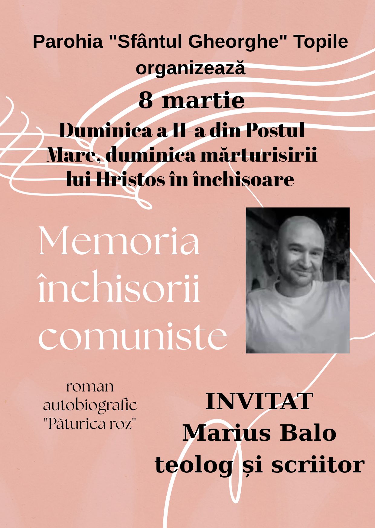 Eveniment la Parohia Sfântul Gheorghe Topile pe 8 martie. Despre „Memoria închisorii comuniste” cu teologul și scriitorul, Marius Balo.