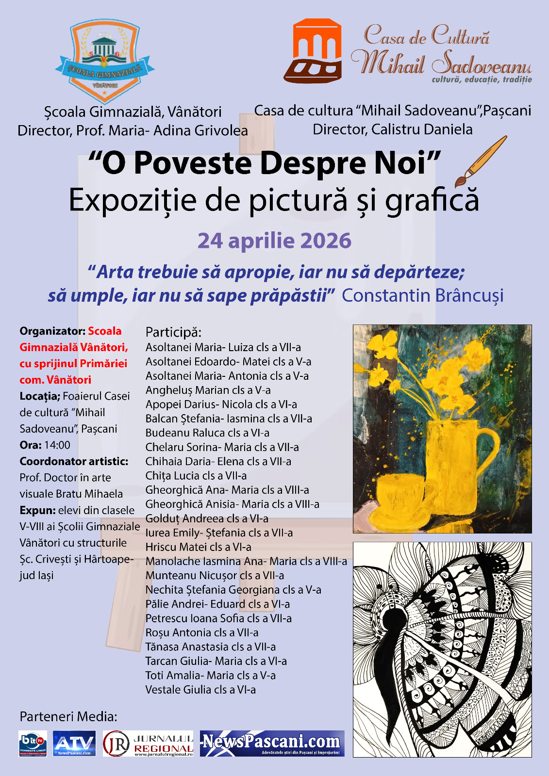 Elvețianul Jean William Fritz Piaget, unul dintre cei mai importanți psihologi ai secolului XX, a demonstrat în urma studiilor efectuate că „dezvoltarea copilului este un proces activ de construcție a cunoașterii, în care desenul devine o formă autentică de reprezentare a lumii interioare” (The Child’s Conception of The World)Plecând de la această premisă, am construit „O poveste despre noi” împreună cu elevi selectați din clasele V-VIII din Școala Gimnazială Vânători comuna Vânători jud. Iași(și din structurile Crivești și Hârtoape) Povestea plastică concepută și finalizată în Modulul IV, 2026 vine în atenția publicului larg cu o abordare plastică și grafică inedită(în ceea ce privește conceptul)ce are la bază libertatea copiilor de exprimare artistică și nevoia de a transmite privitorilor emoțiile lor printr-un dialog intre:formă și culoare, linii și puncte plastice ce converg spre ritmuri plastice sensibile și expresive. „O poveste despre noi” căpătă valoare de discurs narativ. Fiecare linie, formă, pată de culoare sau alegerea unui subiect, a unei idei sub formă de joc, sau a unei întâmplări, anunță înscrierea unei compoziții cu încărcătură emoțională în registre bine delimitate de gândirea creatoare a copilului. Povestea plastică creată astfel ne prezintă universul interior al copilului, percepția lui asupra lumii înconjurătoare, nevoia de explorare a spațiului interior și exterior. Așadar, această EXPOZIȚIE DE PICTURĂ ȘI GRAFICĂ ne invită prin intermediul artei la un dialog sincer, la o reflecție despre :emoții, identitate, valori culturale, inteligența creatoare a copiilor care rezidă în sinceritate, în libertatea gestului pur al fiecărui copil și redescoperirea nu numai a frumuseții universului copiilor dar și a propriului nostru limbaj tainic interior adesea uitat!