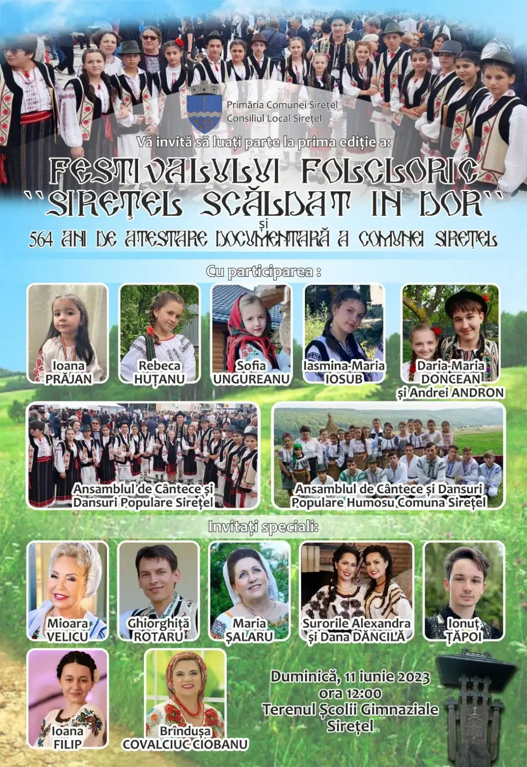 Primăria și Consiliul Local al Comunei Sirețel, cu ocazia împlinirii a 564 ani de atestare documentară a satului Sirețel, organizează pe data de în data de 11.06.2023 prima ediție a Festivalului folcloric “SIREȚEL SCĂLDAT ÎN DOR”.