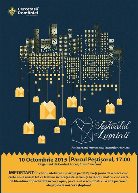 Cercetașii vor lumina Pașcani-ul sâmbătă cu ocazia unui eveniment anual, care a devenit destul de cunoscut în ultimii ani. Festivalul Luminii, organizat anul acesta în Parcul Municipal, așteaptă ca de obicei sute de pășcăneni de toate vârstele cu ateliere interesante și recompense delicioase. Mai mult, iubitorii de lectură vor avea un atelier aparte, organizat pentru prima dată de cercetașii de la Pașcani, în cadrul acestui festival.