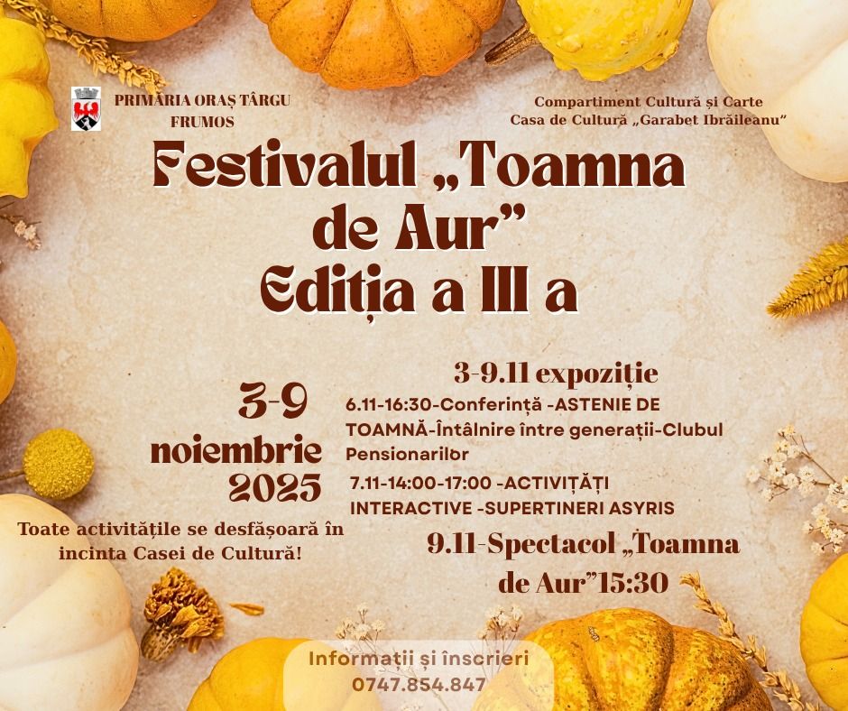 La Casa de Cultură „Garabet Ibrăileanu” din Târgu Frumos se desfășoară, în această săptămână, cea de-a III-a ediție a Festivalului „Toamna de Aur”, un eveniment devenit deja tradiție locală, care reunește activități culturale, educative și recreative dedicate întregii comunități.
