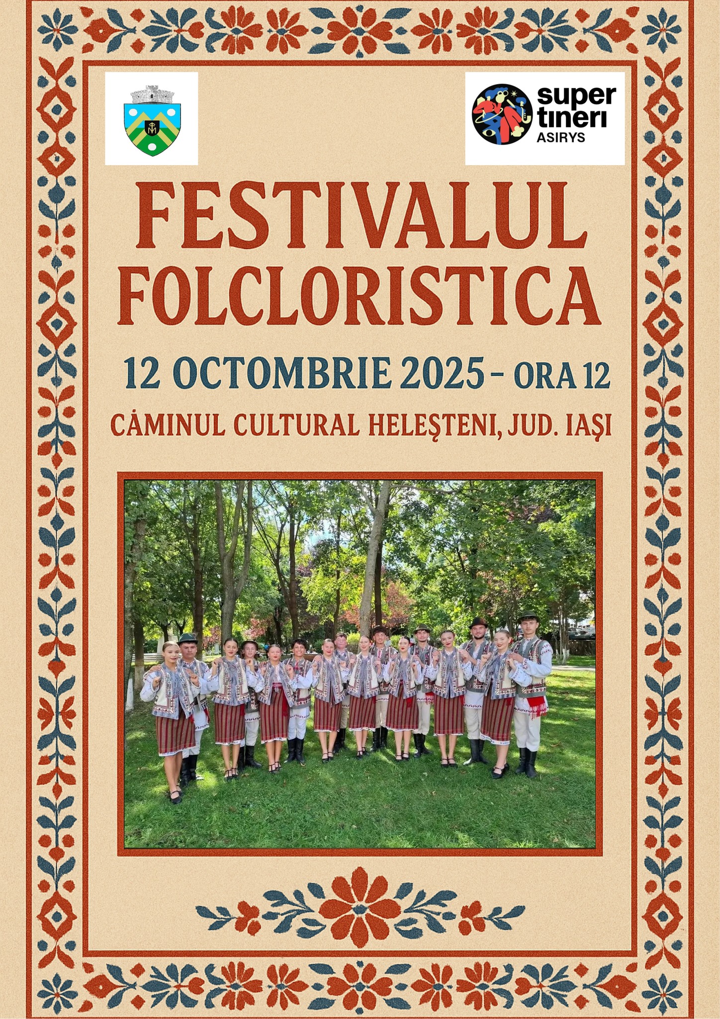 Comuna Heleșteni devine, duminică, 12 octombrie 2025, gazda uneia dintre cele mai îndrăgite manifestări dedicate tradițiilor populare – Festivalul Folcloristica, ajuns la ediția a XI-a. Evenimentul este organizat de Primăria Comunei Heleșteni, în parteneriat cu Asociația Super Tineri ASIRYS din Târgu Frumos, și va avea loc la Căminul Cultural Heleșteni, începând cu ora 12:00.