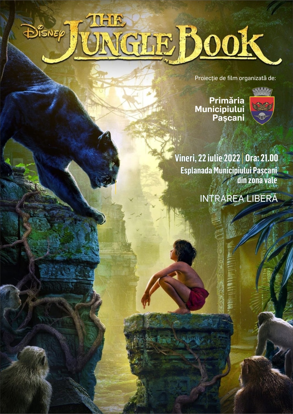 Municipalitatea continuă seria de filme în aer liber, anunțate până în luna septembrie. Vineri seara, 22 iulie, pășcănenii vor vedea filmul pentru copii „Cartea Junglei”, începând cu ora 21:00. Proiecția a fost aleasă de pășcănenii care au răspuns întrebării de pe Facebook, adresată de reprezentanții administrației locale.