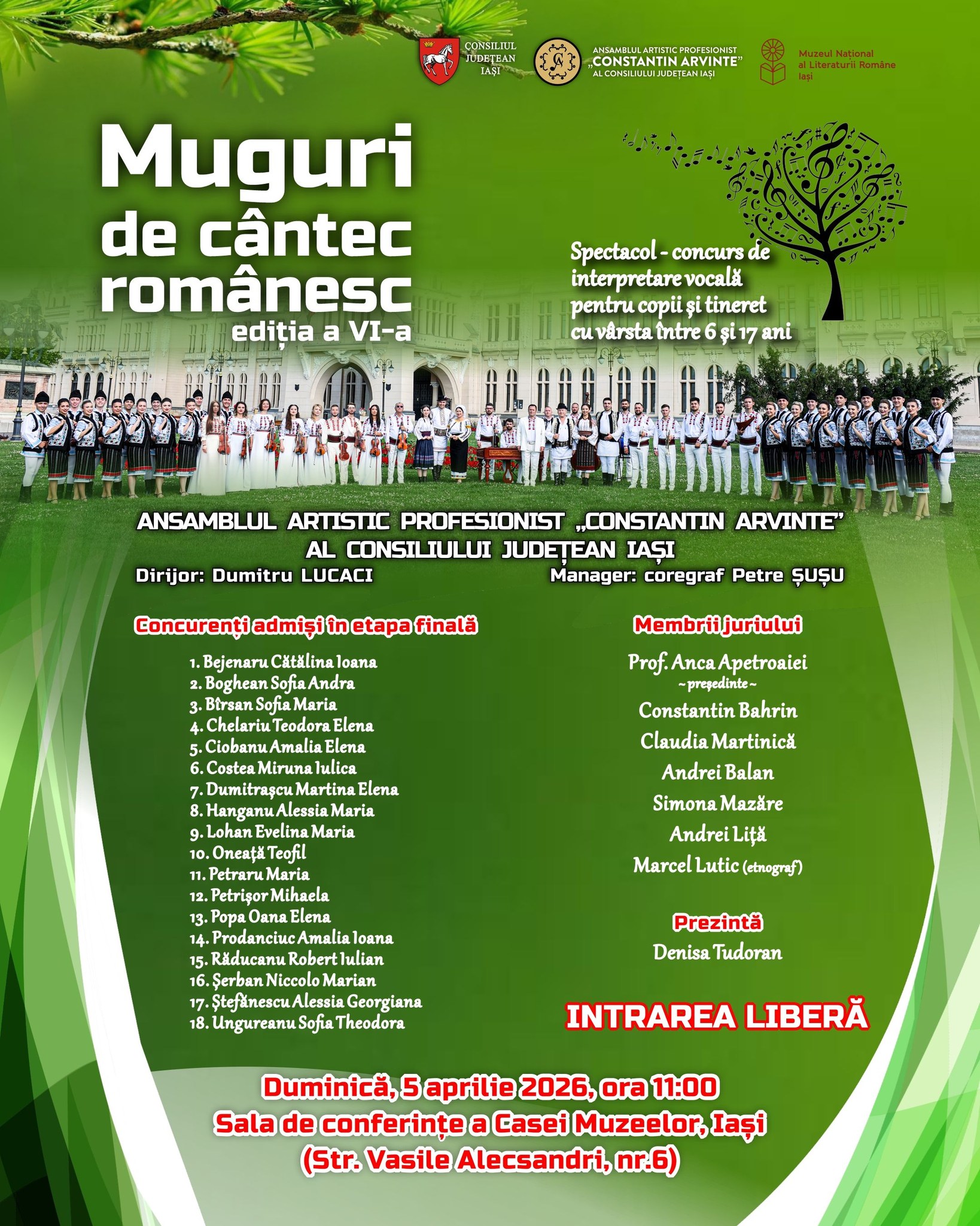 Etapa finală a 𝐂𝐨𝐧𝐜𝐮𝐫𝐬𝐮𝐥𝐮𝐢 „𝐌𝐮𝐠𝐮𝐫𝐢 𝐝𝐞 𝐜â𝐧𝐭𝐞𝐜 𝐫𝐨𝐦â𝐧𝐞𝐬𝐜”, ediția a VI-a, va avea loc duminică, 𝟓 𝐚𝐩𝐫𝐢𝐥𝐢𝐞 𝟐𝟎𝟐𝟔, de la 𝐨𝐫𝐚 𝟏𝟏:𝟎𝟎, în 𝐒𝐚𝐥𝐚 𝐝𝐞 𝐂𝐨𝐧𝐟𝐞𝐫𝐢𝐧ț𝐞 𝐚 𝐂𝐚𝐬𝐞𝐢 𝐌𝐮𝐳𝐞𝐞𝐥𝐨𝐫 din Iași, situată pe str. Vasile Alecsandri, nr. 6.