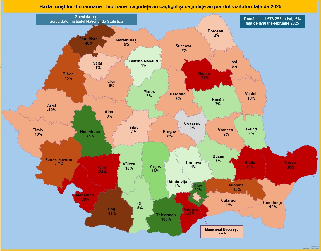 Turismul din Iași a început anul 2026 sub semnul scăderii. În primele două luni, județul a pierdut 6% dintre vizitatori comparativ cu perioada similară din 2025, potrivit datelor oficiale ale Institutului Național de Statistică, analizate de ZDI. Deși municipiul Iași rămâne principalul magnet pentru turiști, câteva comune au bifat evoluții surprinzătoare. În același timp, regiunea Nord-Est continuă să se afle printre cele mai afectate zone din țară, cu o singură excepție notabilă – județul Bacău.