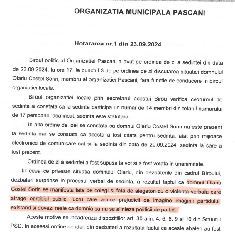 Răsturnare de situație la PSD Pașcani. Tribunalul Iași a anulat Hotărârea nr. 1/23.09.2024 emisă de conducerea organizației prin care consilierul Sorin Olariu a fost exclus din partid. Mai exact, judecătorii ieșeni au admis cererea formulată de consilierul pășcănean și au respins excepțiile invocate de PSD Pașcani, după zece amânări. Hotărârea nu este definitivă și poate fi contestată în apel la Tribunalul Iași în maximum 30 de zile. În acest context, Olariu rămâne în continuare consilier local, iar dacă hotărârea instanței va rămâne definitivă, își va recăpăta drepturile depline de membru al PSD.