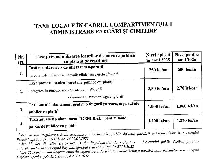 De asemenea, Primăria Pașcani se pregătește să transforme parcările publice în locuri cu plată. Deocamdată nu se știe care vor fi locațiile și câte parcări vor fi amenajate, dar în hotărârea cu taxele și impozitele locale pentru anul 2026 a fost cuprinsă și majorată taxa de parcare de la 2,5 la 2,7 lei/oră. De asemenea, abonamentul anual pentru un singur loc de parcare publică a crescut de la 1.000 la 1.060 lei pe an, iar abonamentul general valabil pentru toate parcările publice din Pașcani de la 1.200 la 1.270 lei/an.