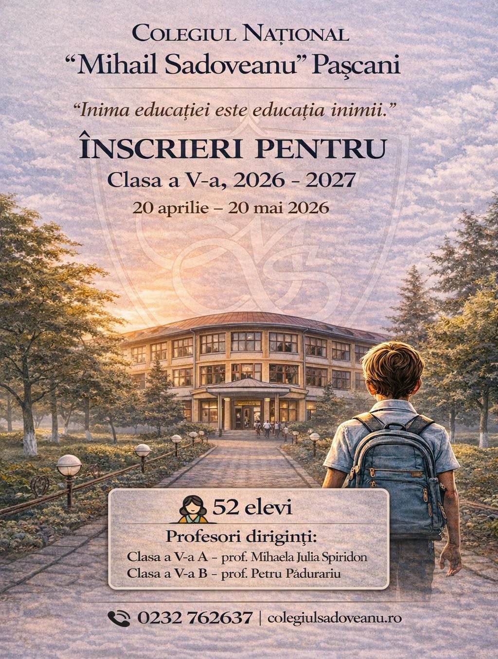 Încep înscrierile pentru clasa a V-a, din anul școlar viitor. Printre școlile din județ care organizează astfel de înscrieri se află și Colegiul Național „Mihail Sadoveanu” din Pașcani.