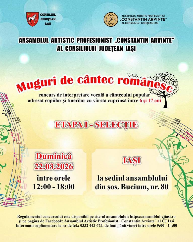 Încep înscrierile pentru o nouă ediție a concursului „Muguri de cântec românesc” organizat de Ansamblul Profesionist „C-tin Arvinte” al Consiliului Județean Iași