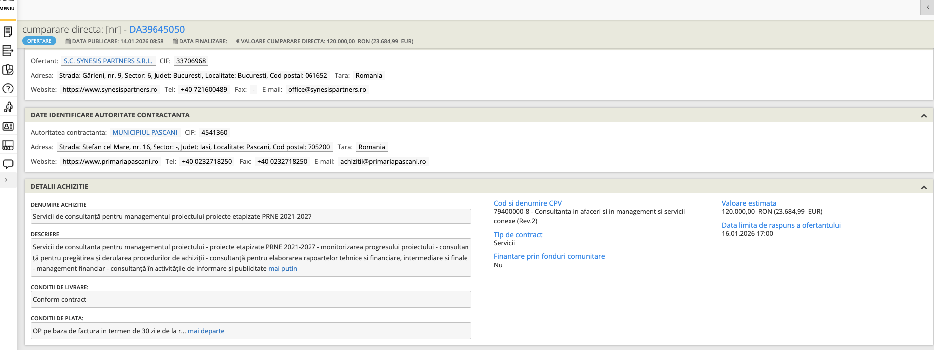 De aceste servicii se va ocupa societatea SYNESIS PARTENERS SRL. Serviciile au fost achiziționate prin cumpărare directă pentru suma de 120.000 lei fără TVA. Societatea se va ocupa de pregătirea „procedurilor de achiziții și elaborarea rapoartelor tehnice și financiare intermediare și finale”. De asemenea, societatea va acorda consulanță și pentru managementul proiectului.