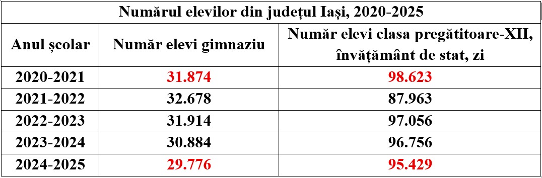 Datele din rapoartele „Starea învățământului ieșean” confirmă un declin al populației școlare în ultimii ani. Dacă în anul școlar 2020-2021 erau înscriși 98.623 de elevi în județul Iași (clasele pregătitoare – XII), în anul școlar 2024-2025 numărul acestora a scăzut la 95.429. O diminuare este vizibilă și la nivel gimnazial: de la 31.874 de elevi în 2020-2021 la 29.776 în 2024-2025.