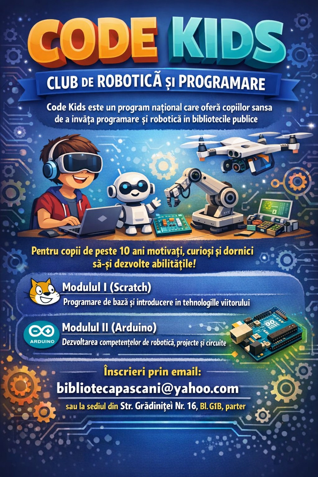 Biblioteca Municipală Leonard Gavriliu Pașcani deschide înscrierile pentru o nouă grupă de începători în cadrul programului Code Kids. Proiectul se adresează copiilor care au vîrste între 10 și 14 ani și care vor să facă primii pași în programare și tehnologie, prin jocuri, animații și proiecte în Scratch și Arduino.