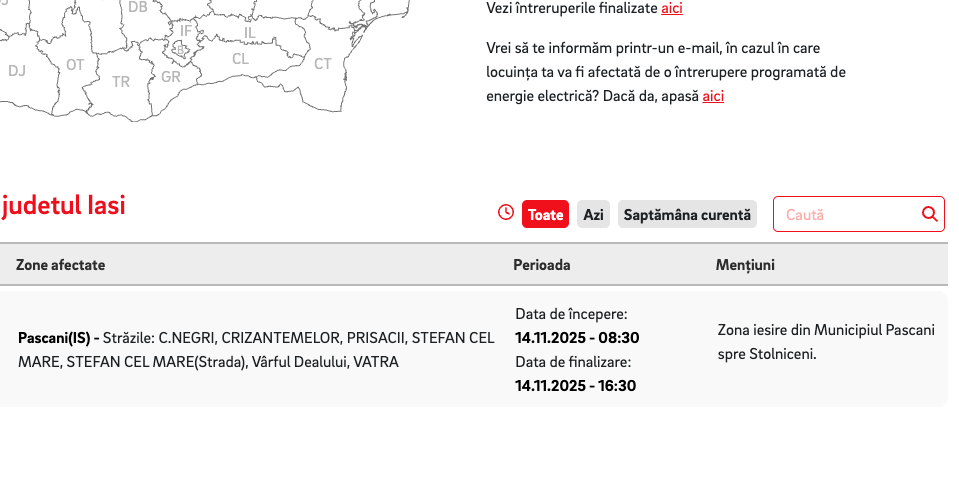 Locuitorii din zona de ieșire din municipiul Pașcani spre Stolniceni-Prăjescu vor rămâne fără energie electrică vineri, 14 noiembrie 2025, între orele 08:30 și 16:30, din cauza unor lucrări programate de întreținere în rețea.