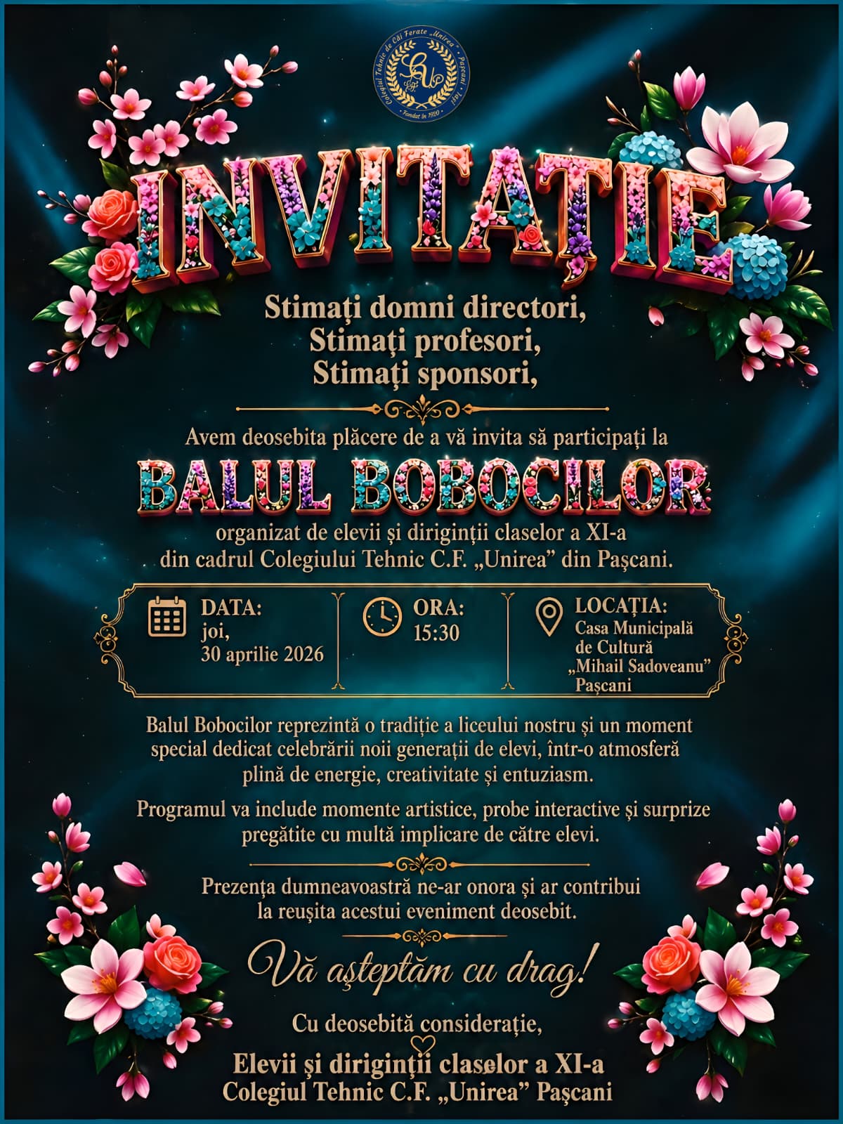 Eveniment important pentru liceenii de la Colegiul CF Unirea din Pașcani. Joi, 30 aprilie, de la ora 15:30, va avea loc Balul Bobocilor pe scena Casa de Cultură Mihail Sadoveanu din municipiu. Programul va include momente artistice, probe interactive și surprize pregătite de către elevi.