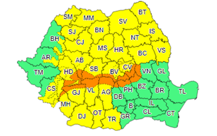 Administratia Nationala de Meteorologie a emis, miercuri, mai multe atentionari de tip cod galben si una de tip portocaliu de vreme rea pentru mai multe judete, fiind inclus si judetul Iasi.