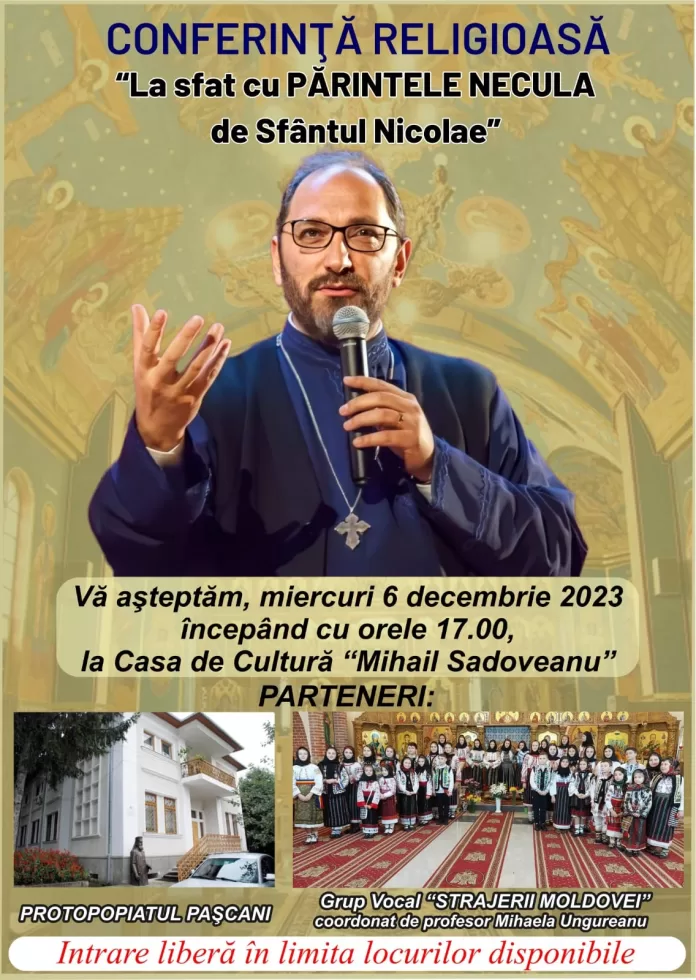 Conoscutul preot ortodox Constantin Necula va susține o conferință religioasa la Casa de Cultura din Pașcani. Evenimentul este organizat împreună cu Protopopiatul din Pașcani si Grupul Vocal „Stajerii Moldovei”, pe 06 decembrie începând cu ora 17.00. Intrarea este libera, in limita locurilor disponibile.