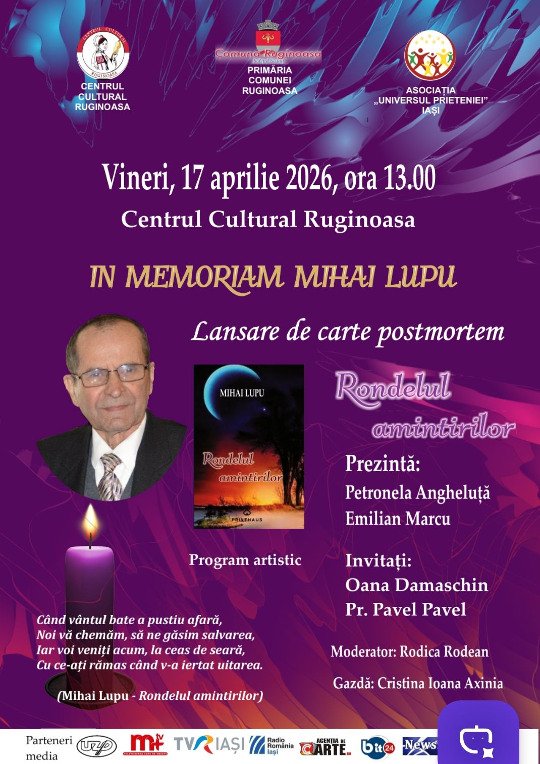 Eveniment deosebit în Săptămâna luminată, la Centrul Cultural Ruginioasa. Vineri, 17 aprilie, va avea loc o lansare de carte postmortem. Este vorba despre volumul „Rondelul amintirilor”, de Mihai Lupu. Intâlnirea va fi prezentată de Petronela Angheluță și Emilian Marcu, iar invitați sunt Oana Damaschin și părintele Pavel Pavel. Moderatorul evenimentului va fi Rodica Rodean, iar gazdă, Cristina Ioana Axinia.