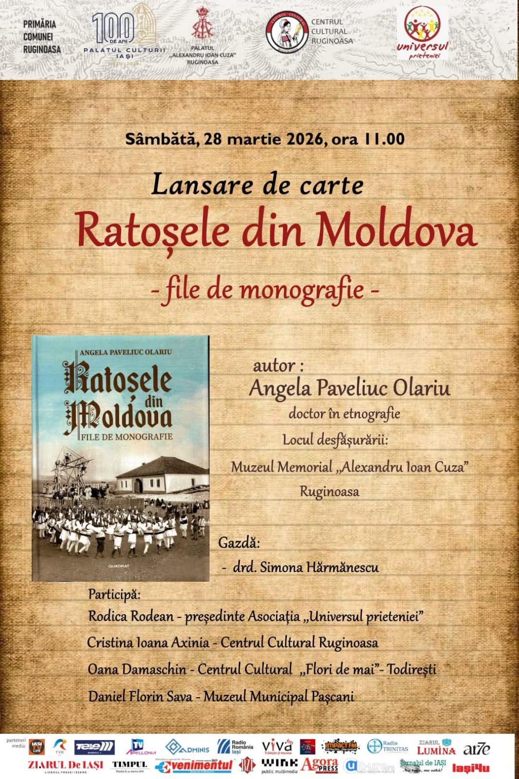 Sâmbătă, 28 martie, de la ora 11:00, va avea loc lansarea volumului „Ratoșele din Moldova – file de monografie”, semnat de Angela Paveliuc Olariu, una dintre personalitățile importante ale etnografiei românești. Evenimentul va fi moderat de drd. istoric Simona Hărmănescu.