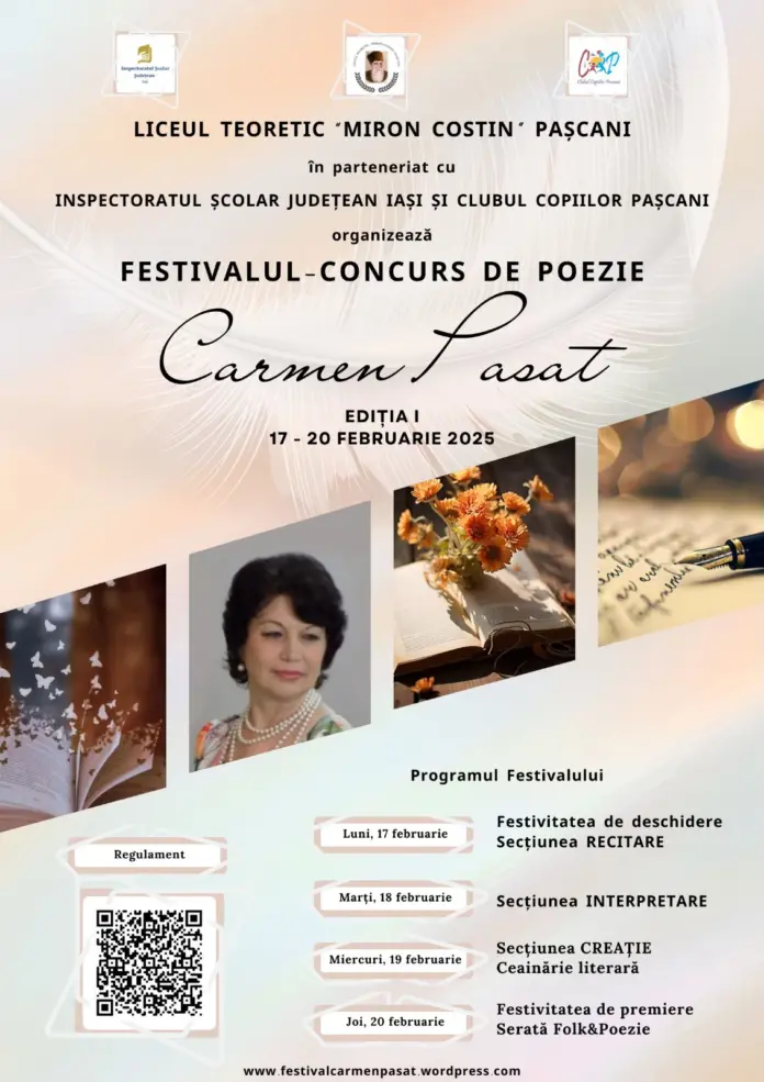 Inițiativă deosebită din partea Liceul Teoretic Miron Costin din municipiul Pașcani. Unitatea de învățământ organizează la sfârșitul lunii februarie un amplu festival concurs de poezie în amintirea fostei profesoare, Carmen Pasat.