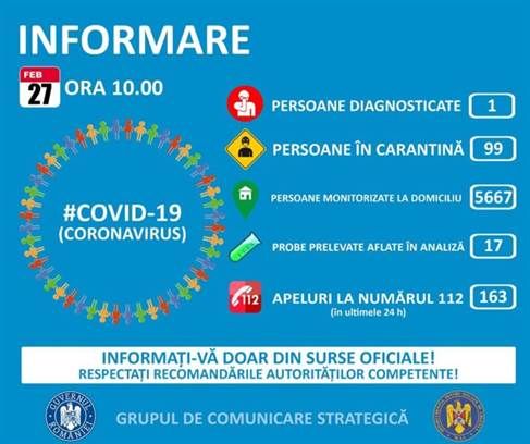 „Rugăm cetățenii să apeleze numărul unic de urgență 112 doar pentru situații de urgență, iar pentru solicitarea de informații să apeleze linia Telverde. Programul de funcționare al liniei verde este zilnic, între orele 08.00 și 23.00, inclusiv în zilele de sâmbătă și duminică. La această linie telefonică pot fi solicitate informații despre modul în care se manifestă virusul, modalități de prevenire a îmbolnăvirii și alte detalii legate de conduita preventivă”, potrivit unui comunicat al grupului de comunicare strategică.